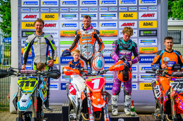 Nach dem Warm-Up am Renntag zeigte sich Jan Deitenbach zufrieden mit den Änderungen. So konnte er zuversichtlich in die Rennen gehen. Beim ersten Rennen gelang der Start gut, aber in der ersten Kurve wurde er von den Fahrern in der ersten Reihe eingeklemmt, somit ging es nur auf Platz vier vor. Rad an Rad hing die Führungsgruppe zusammen, als Deitenbach in Runde vier im Geländeteil kurz das Vorderrad wegrutschte. Obwohl er schnell wieder auf dem Motorrad saß, war die Gruppe über zehn Sekunden enteilt und Deitenbach auf Platz sieben zurückgefallen. Jetzt legte er konzentriert los und arbeitet sich wieder nach vorne. Zwei Runden vor dem Ende war er wieder auf Rang fünf und kreuzte nur drei Sekunden hinter der Spitzengruppe die Ziellinie. „Schade, ein kleiner Fehler, ärgerlich, aber kann passieren“, erklärte Deitenbach. „Aber mit meinem Rennen danach war ich sehr zufrieden, auch wenn es nicht mehr bis auf das Podium gereicht hat.“